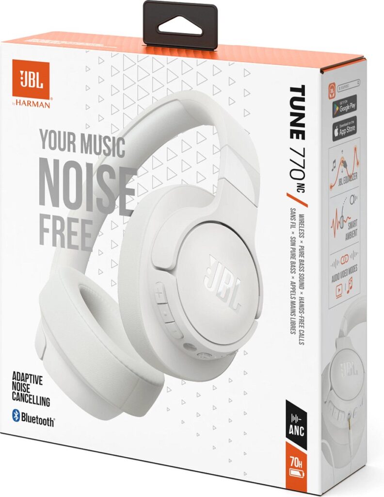 Als je muziek aanstaat, is dat het enige dat telt. De JBL Tune 770NC draadloze koptelefoon met adaptieve ruisonderdrukking maakt die belofte helemaal waar, zonder dat je afgeleid wordt. Met een batterijduur tot wel 70 uur kom je gemakkelijk een drukke werkweek door en heb je nog steeds genoeg JBL Pure Bass Sound voor het weekend. En als je toch even snel moet opladen, geeft een oplaadbeurt van 5 minuten je 3 uur extra muziek. De lichte en opvouwbare JBL Tune 770NC kan verbinding maken met twee Bluetooth®-apparaten tegelijk, zodat je nooit een gesprek mist terwijl je een film kijkt op je tablet. Met de gratis JBL Headphones-app kun je het geluid op jouw voorkeuren afstemmen. En spraakaanwijzingen in jouw taal maken je wegwijs door de functies. Beheer je oproepen en stemassistent probleemloos vanaf je telefoon en gebruik VoiceAware om jezelf te horen wanneer je spreekt.