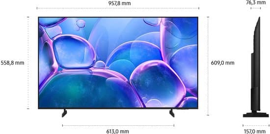 Samsung GU43U7079FU. Beeldschermdiagonaal: 109,2 cm (43″), Resolutie: 3840 x 2160 Pixels, HD type: 4K Ultra HD, Display technologie: LED, Beeldscherm vorm: Flat. Smart TV. Motion interpolation technologie: Motion Xcelerator, Oorspronkelijke beeldverhouding: 16:9. Formaat digitaal signaal: DVB-C, DVB-S2, DVB-T2. Wifi, Ethernet LAN. Kleur van het product: Zwart