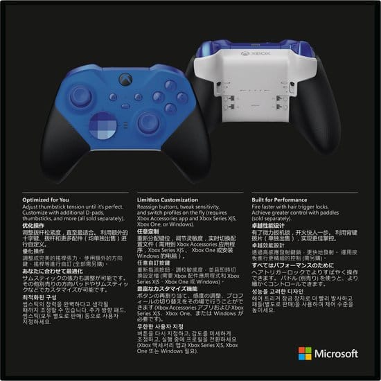 - Speel als een professional met de Xbox Elite controller– Core in het Blauw , met duimsticks met instelbare spanning, rubberen grip rondom en kortere haartriggers.