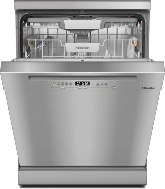 Miele G 5410 SC Front Active Plus. Apparaatplaatsing: Vrijstaand, Productafmeting: Volledige grootte (60 cm), Deurkleur: Roestvrijstaal. Aantal couverts: 14 couverts, Geluidsemissieklasse: B, Geluidsniveau: 44 dB. Energie-efficiëntieklasse: B, Waterconsumptie per cyclus: 8,4 l, Energieverbruik per 100 cycli: 64 kWu. Breedte: 598 mm, Diepte: 600 mm, Hoogte: 845 mm. Miele-technologieën (afwas): 3D MultiFlex tray, AutoOpen drying, BrilliantGlassCare, ComfortClose, EcoPower, QuickPowerWash,… Roestvrijstaal Volledige grootte (60 cm) Vrijstaand 14 couverts Energie-efficiëntieklasse: B Energieverbruik per 100 cycli: 64 kWu Geluidsemissieklasse: B 44 dB Auto, Zacht, Eco, Intensive 75°C, Snel