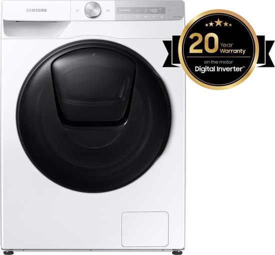 Samsung WD10T754DBH. Type lader: Voorbelading, Apparaatplaatsing: Vrijstaand, Kleur van het product: Wit. Droogcapciteit: 6 kg, Maximale centrifugesnelheid: 1400 RPM, Centrifuge-droger klasse: B. Energie-efficiëntieklasse (wassen): E, Energie-efficiëntieklasse (wassen en drogen): A, Water verbruik wassen: 53 l. Samsung-technologieën (kledingzorg): Auto Dose, QuickDrive™, ecobubble™. Diepte: 600 mm, Breedte: 600 mm, Hoogte: 850 mm