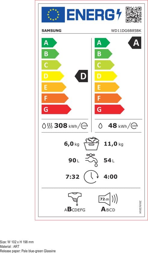Samsung WD11DG6B85BK. Type lader: Voorbelading, Apparaatplaatsing: Vrijstaand, Kleur van het product: Wit. Droogcapciteit: 6 kg, Maximale centrifugesnelheid: 1400 RPM, Centrifuge-droger klasse: B. Energie-efficiëntieklasse (wassen): A, Energie-efficiëntieklasse (wassen en drogen): D, Water verbruik wassen: 54 l. Garantieperiode: 2 jaar. Samsung-technologieën (kledingzorg): AI Wash, Auto Dose, Hygiënische stoom, ecobubble™