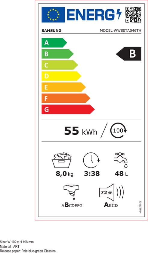 Samsung WW80TA046TH/EF. Type lader: Voorbelading. Nominale capaciteit: 8 kg, Centrifuge-droger klasse: A, Geluidsniveau bij centrifugeren: 72 dB, Geluidsniveau (wassen): 53 dB, Maximale centrifugesnelheid: 1400 RPM. Jaarlijks waterverbruik wassen: 8100 l. Kleur van het product: Wit. Breedte: 600 mm, Diepte: 550 mm, Hoogte: 850 mm. Energie-efficiëntieklasse: B